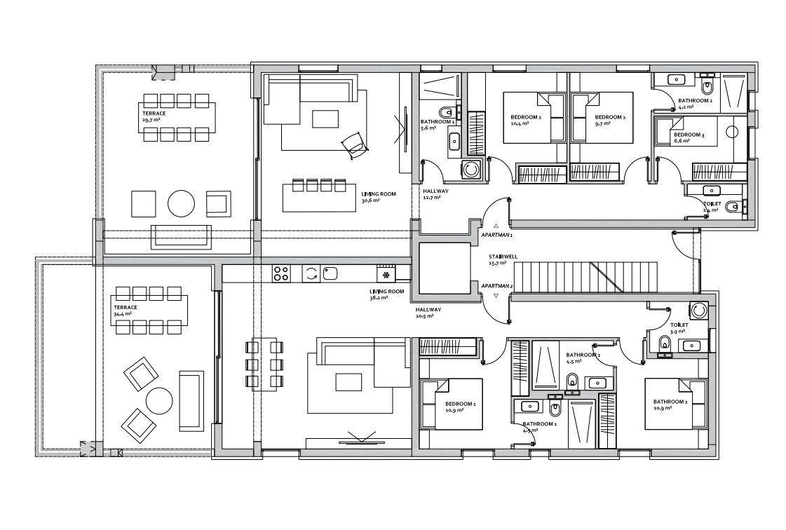 S3 - Dreizimmer-Apartment - befindet sich im ersten Stock und besteht aus einer Küche, einem Esszimmer, einem Wohnzimmer, einem Flur, 3 Schlafzimmern, 2 Badezimmern, einer Toilette und einem Balkon von 30 m2. Im Keller des Gebäudes befinden sich ein Abstellraum und 2 Garagenstellplätze. Preis des Apartments: 1.011.666,25 Euro.