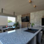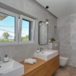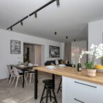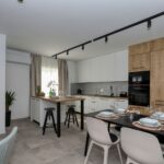 Im Obergeschoss befindet sich eine Dreizimmerwohnung mit zwei Badezimmern, Flur, Esszimmer und Küche, Wohnzimmer und einer großen überdachten Terrasse von 30,90 m2. Im Wohnzimmer befindet sich eine Treppe zur Galerie von 18,09 m2. Die Gesamtgrundfläche der Wohnung im Obergeschoss beträgt 166,98 m2. Die Heizung im Obergeschoss erfolgt durch einen Holzofen und eine Klimaanlage, es wurde auch eine Vorbereitung für eine elektrische Zentralheizung installiert.