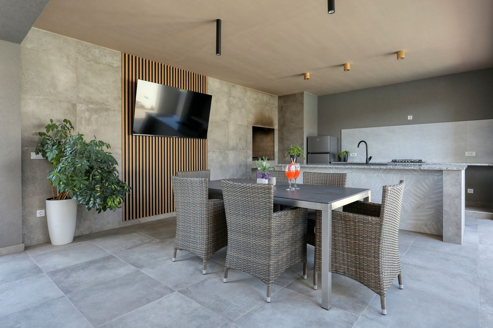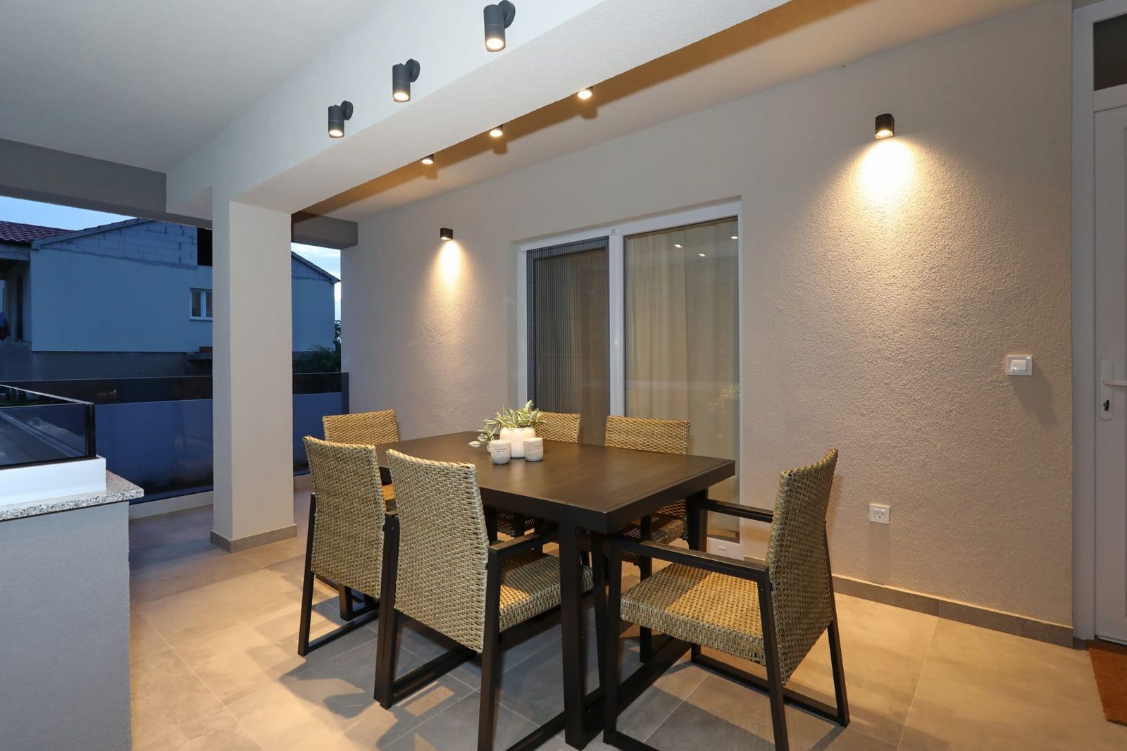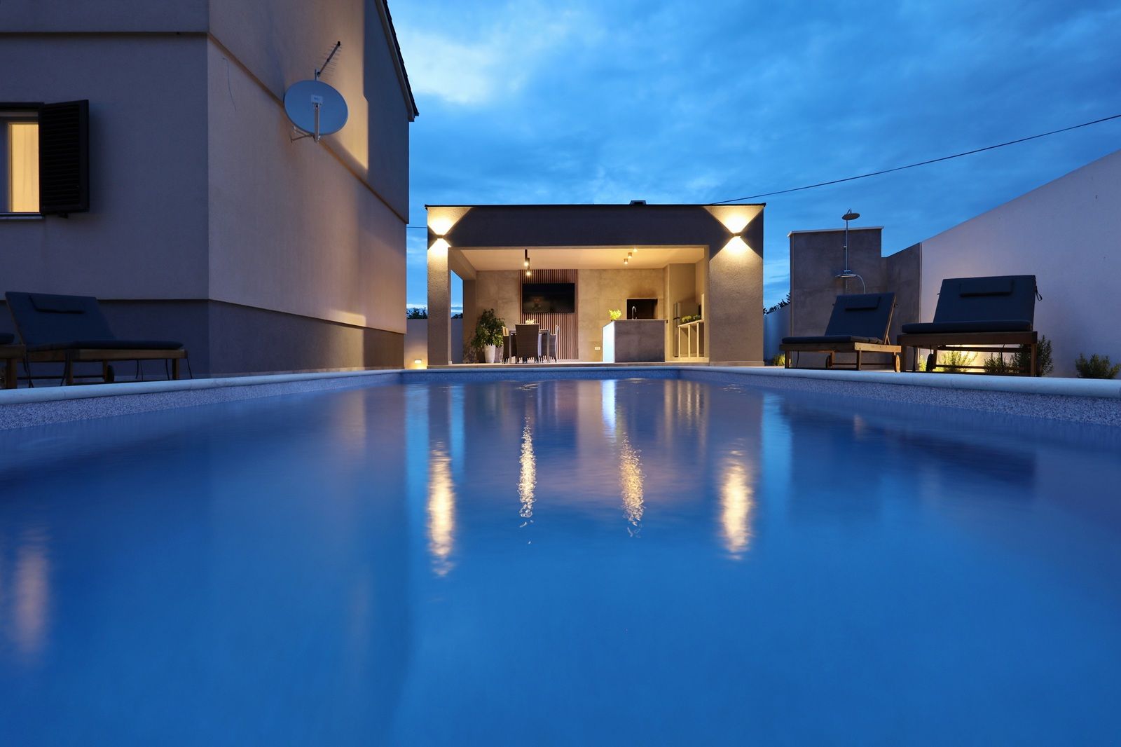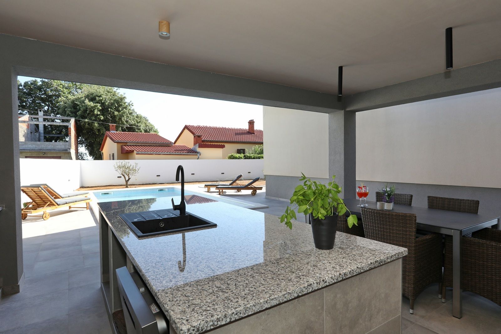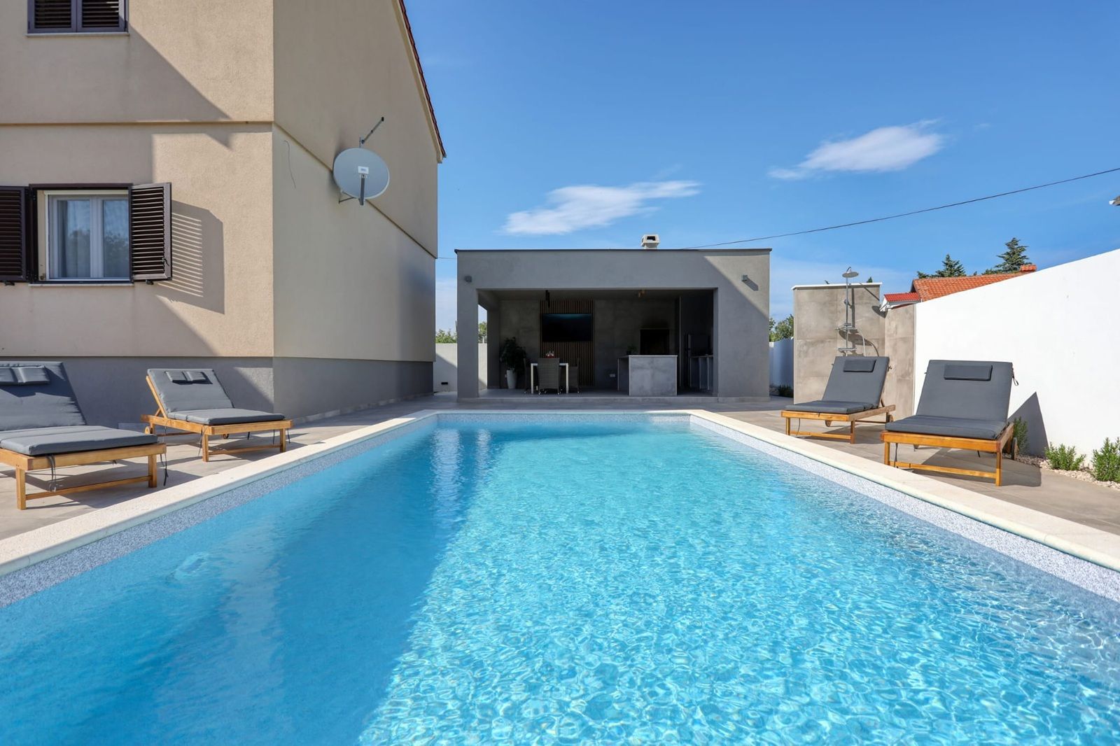 Im gepflegten Garten des Hauses befinden sich ein Parkplatz, Technikraum, WC, Sommerküche und ein Pool von 32 m2. Die Installation für eine Poolheizung ist vorbereitet.