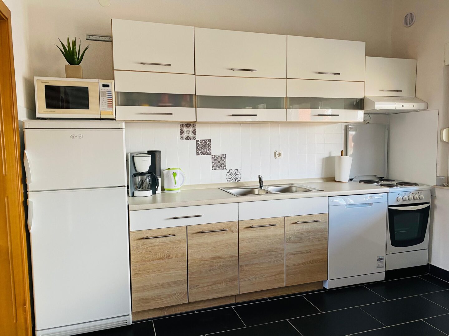 Nin/Grbe - Das Objekt besteht aus zwei komplett möblierten und bezugsfertigen Apartments. Die Apartments bestehen aus zwei Zimmern, einem geräumigen Eingangsbereich mit Küche und Esszimmer. Der Außenbereich der Apartments verfügt über einen Steintisch und Steinbänke, sowie einen Kamin und zwei Abstellräume. Die Außenwand ist während der Nacht beleuchtet. Die Apartments sind während der gesamten Saison vermietet.