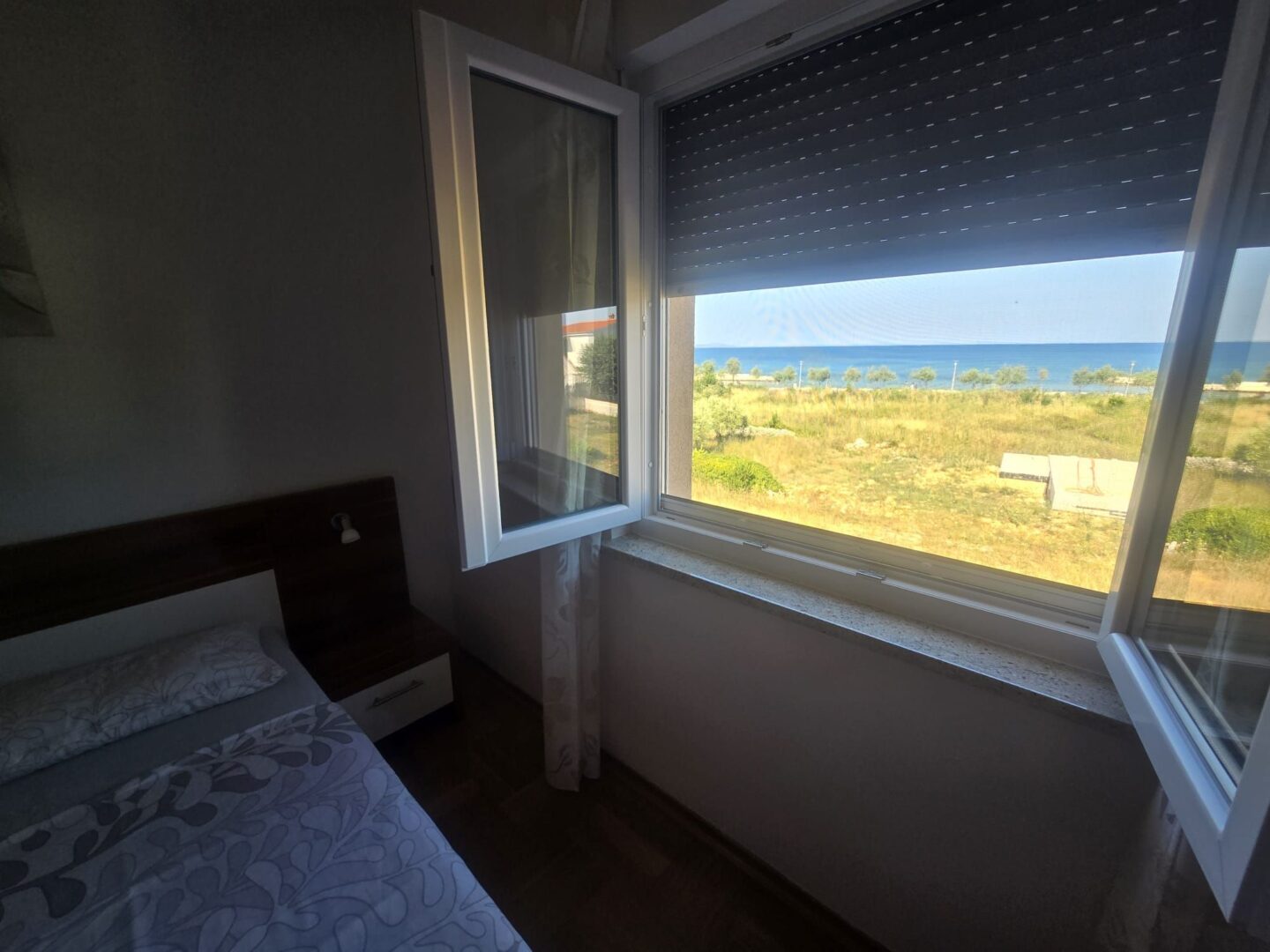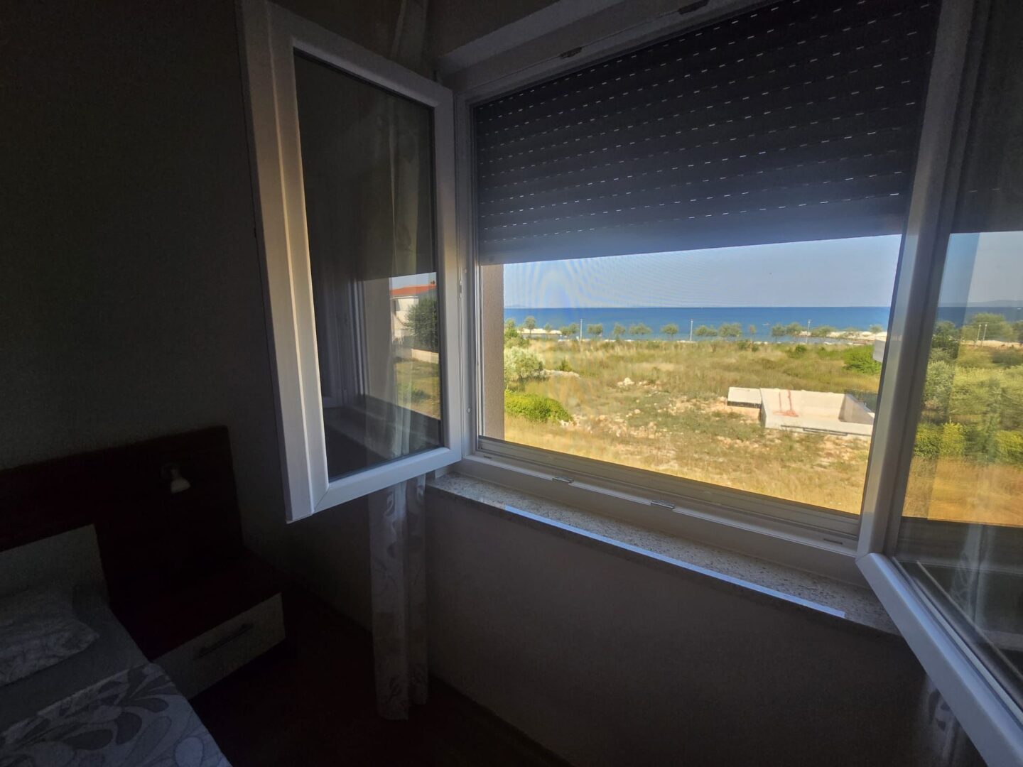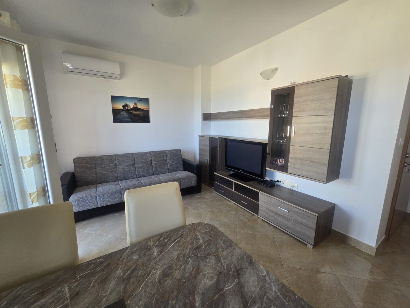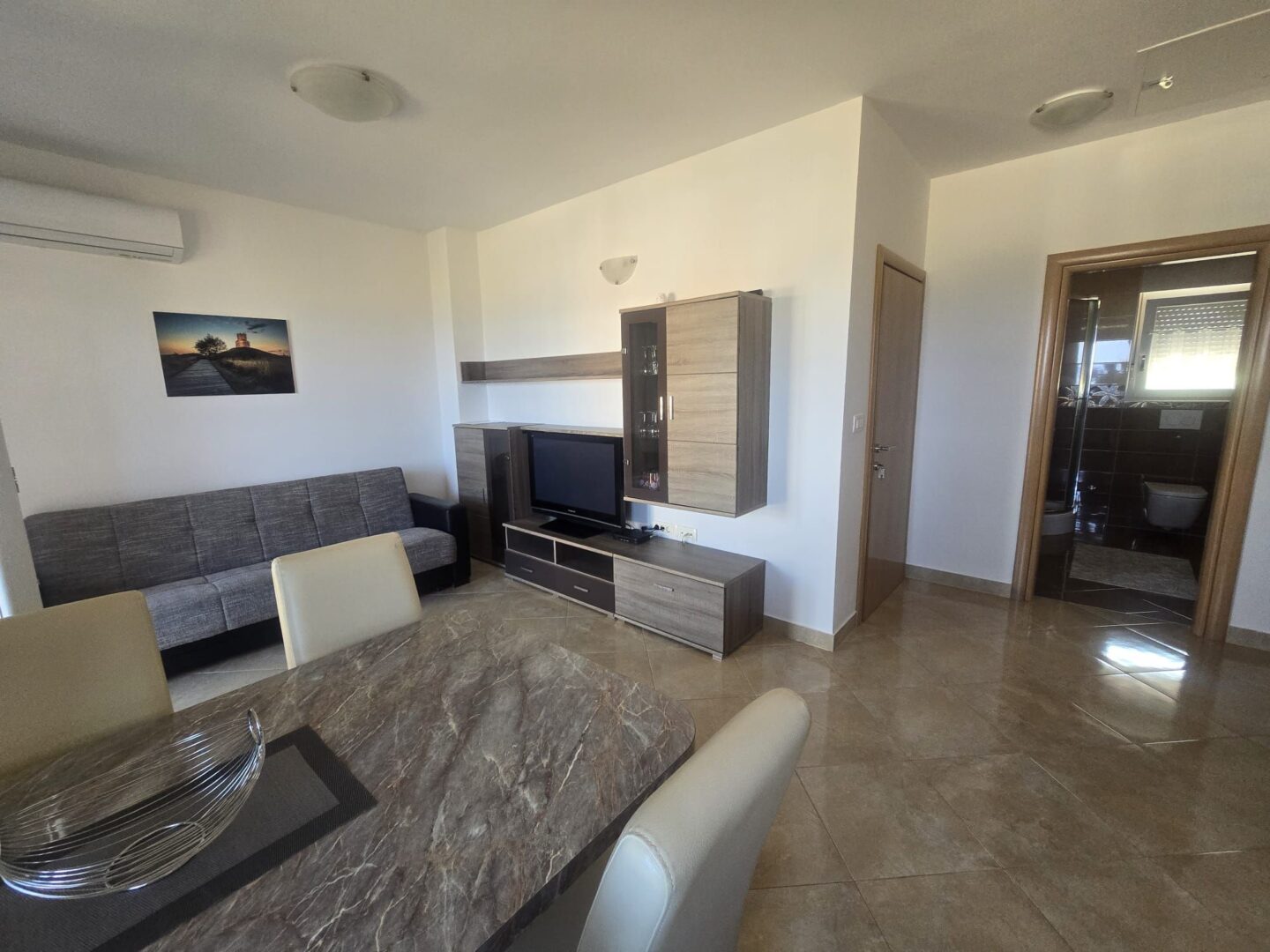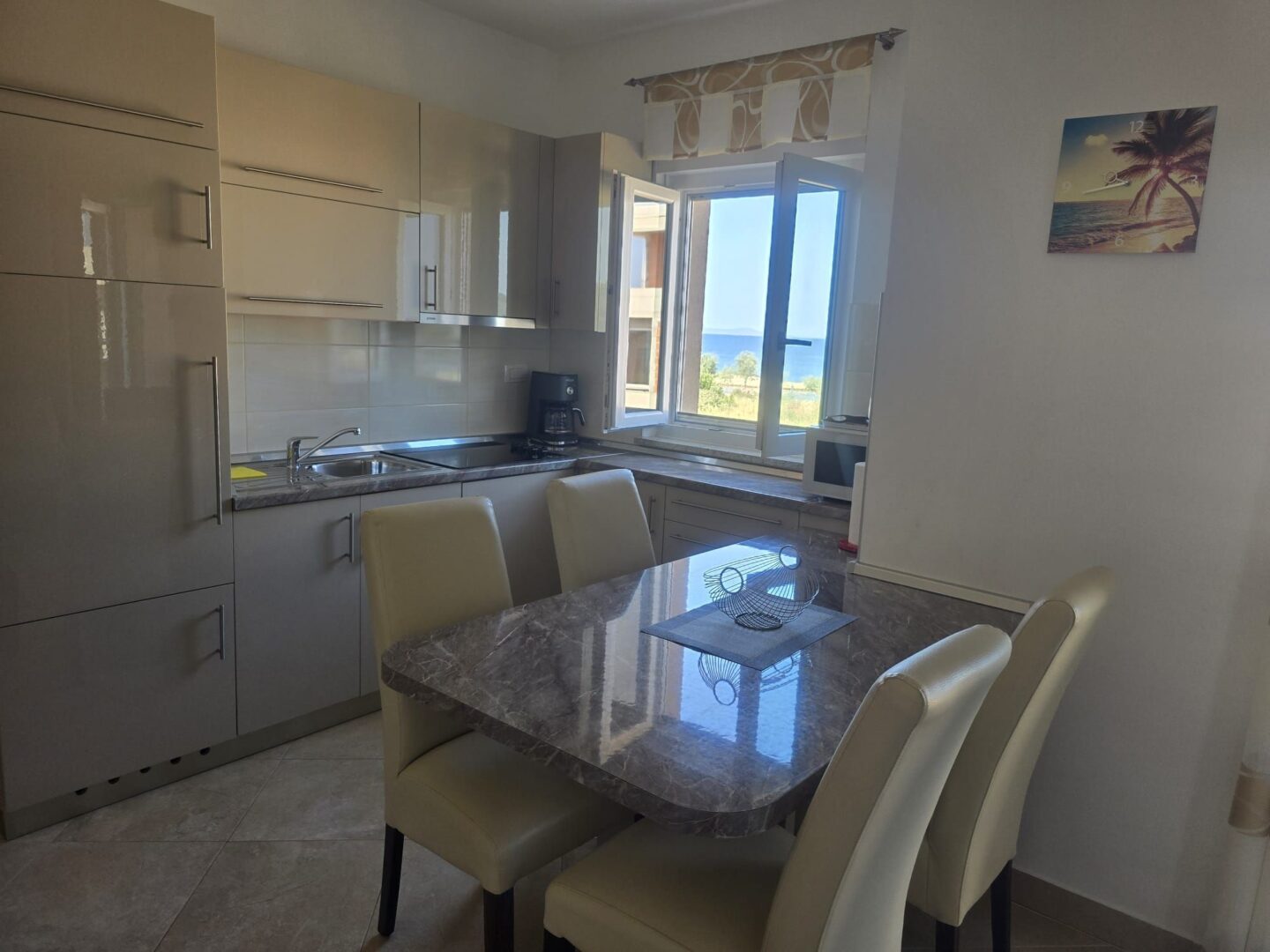 In demselben Gebäude wird eine Zwei-Zimmer-Wohnung mit einer Grundfläche von 57,90 m2 im Erdgeschoss verkauft. Sie besteht aus einer Küche, einem Esszimmer, einem Wohnzimmer, einer Loggia, einer Terrasse, einem Badezimmer und zwei Schlafzimmern. Von der Küche, einem Schlafzimmer und der Terrasse aus bietet sich ein offener Blick auf das Meer. Zur Wohnung gehören zwei Parkplätze mit einer Fläche von 26 m2, ein Hof und ein Garten mit einem Außengrill mit einer Fläche von 39,80 m2. Die Gesamtbruttowohnfläche der Wohnung mit Zubehör beträgt 123,70 m2 (Nettowohnfläche 71,94 m2). Preis: 268.000,00 Euro.