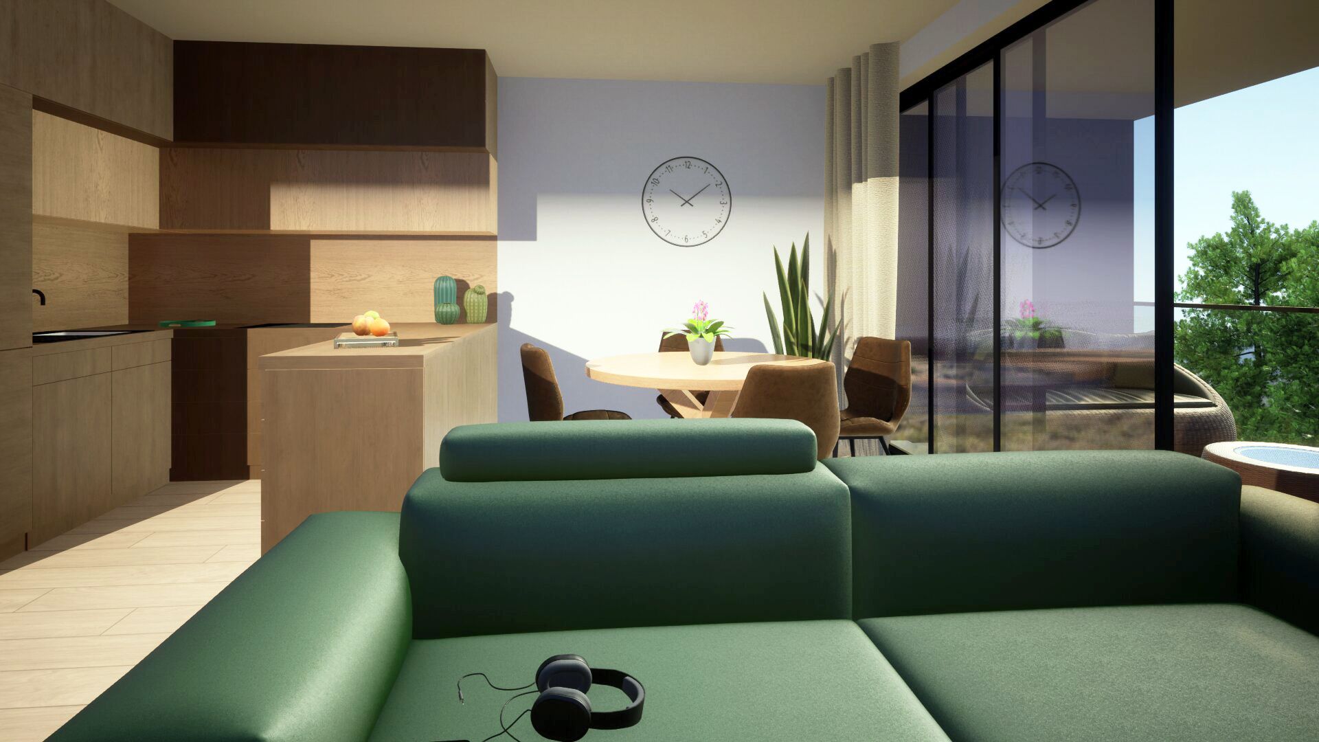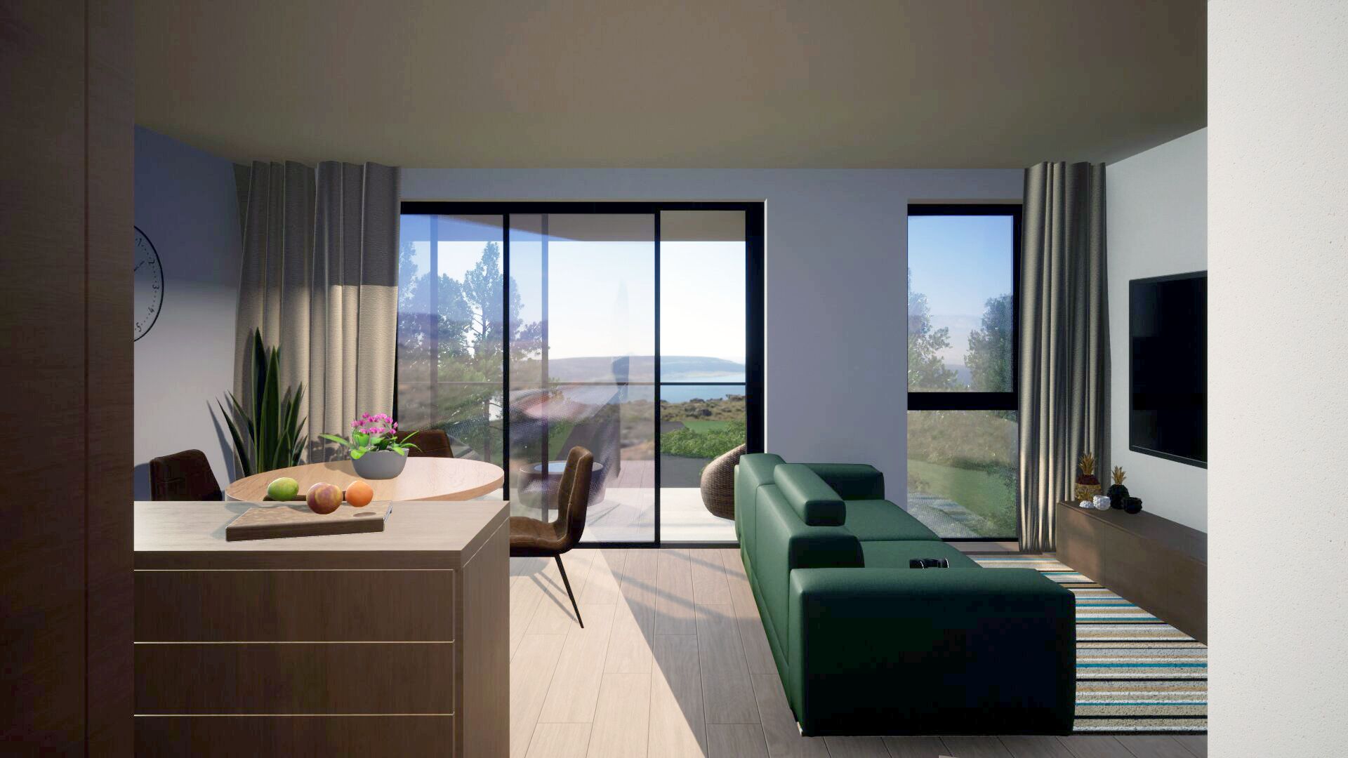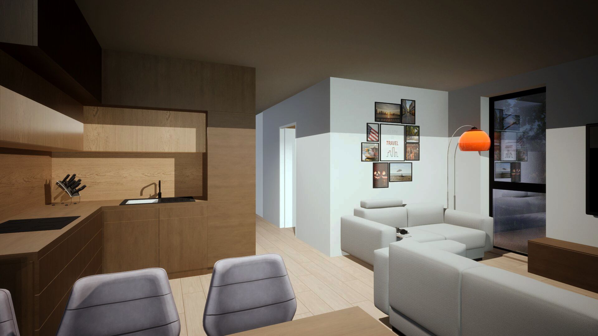 Das Apartment besteht aus einem Flur, zwei Schlafzimmern und einem Badezimmer, sowie einer Küche, einem Wohnzimmer und einem Esszimmer. Die Gesamtgrundfläche des Apartments beträgt 53,89 m2. Zum Apartment gehören auch ein Teil des Gartens und zwei Parkplätze.