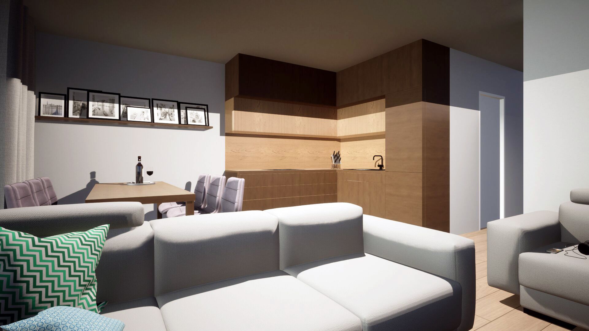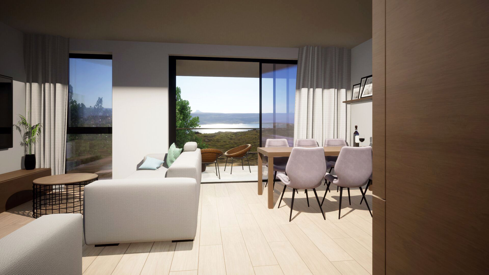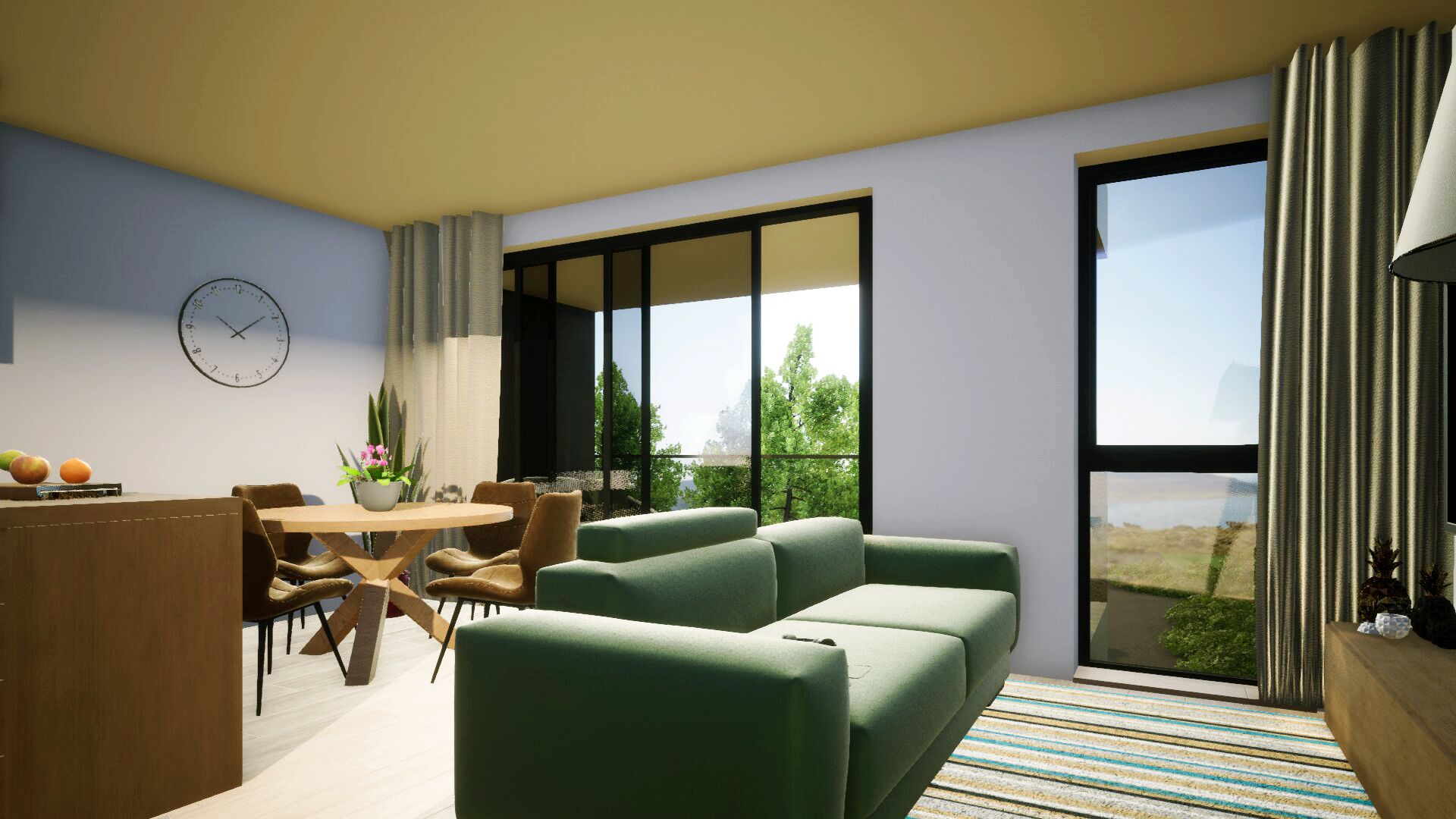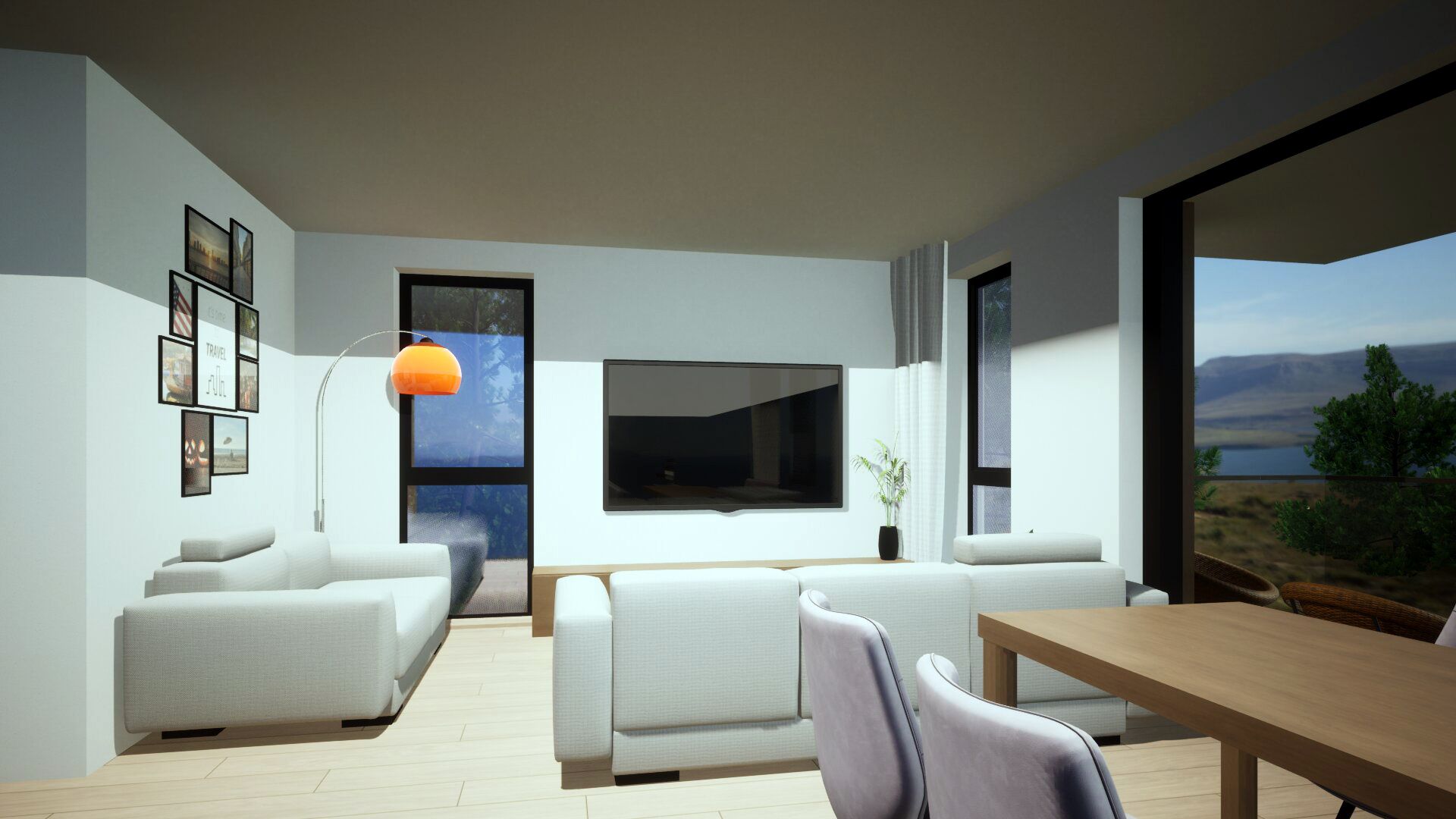 Das Apartment besteht aus einem Flur, zwei Schlafzimmern und einem Badezimmer, sowie einer Küche, einem Wohnzimmer und einem Esszimmer. Die Gesamtgrundfläche des Apartments beträgt 53,89 m2. Zum Apartment gehören auch ein Teil des Gartens und zwei Parkplätze.