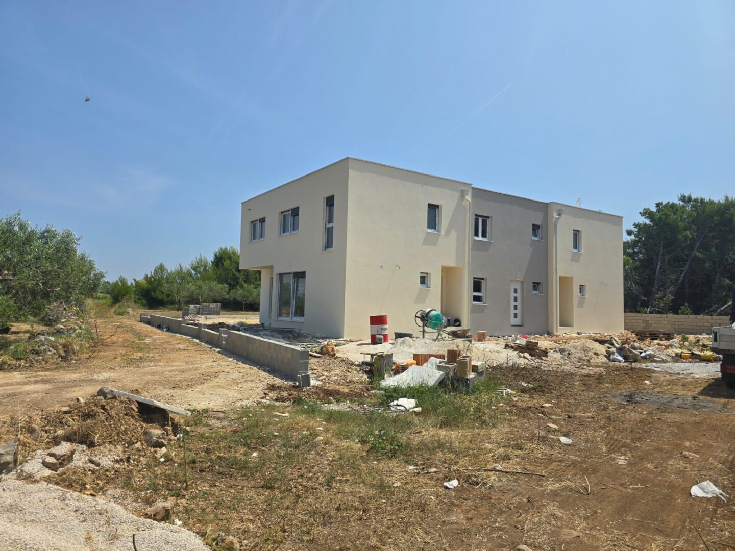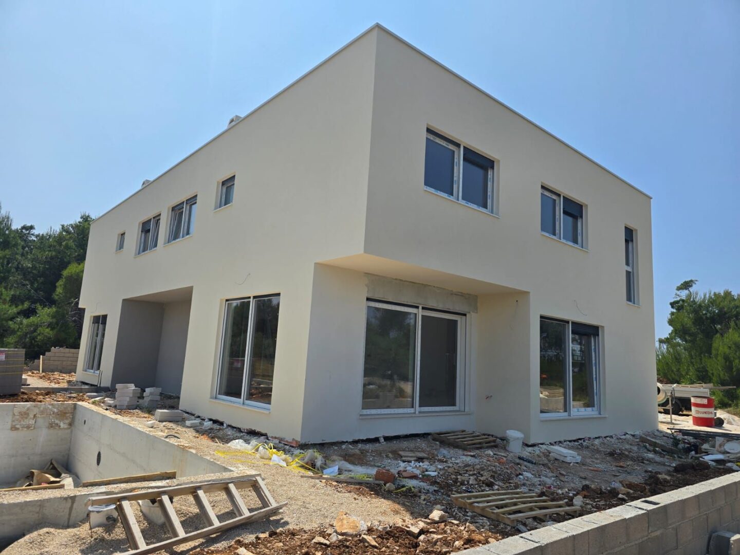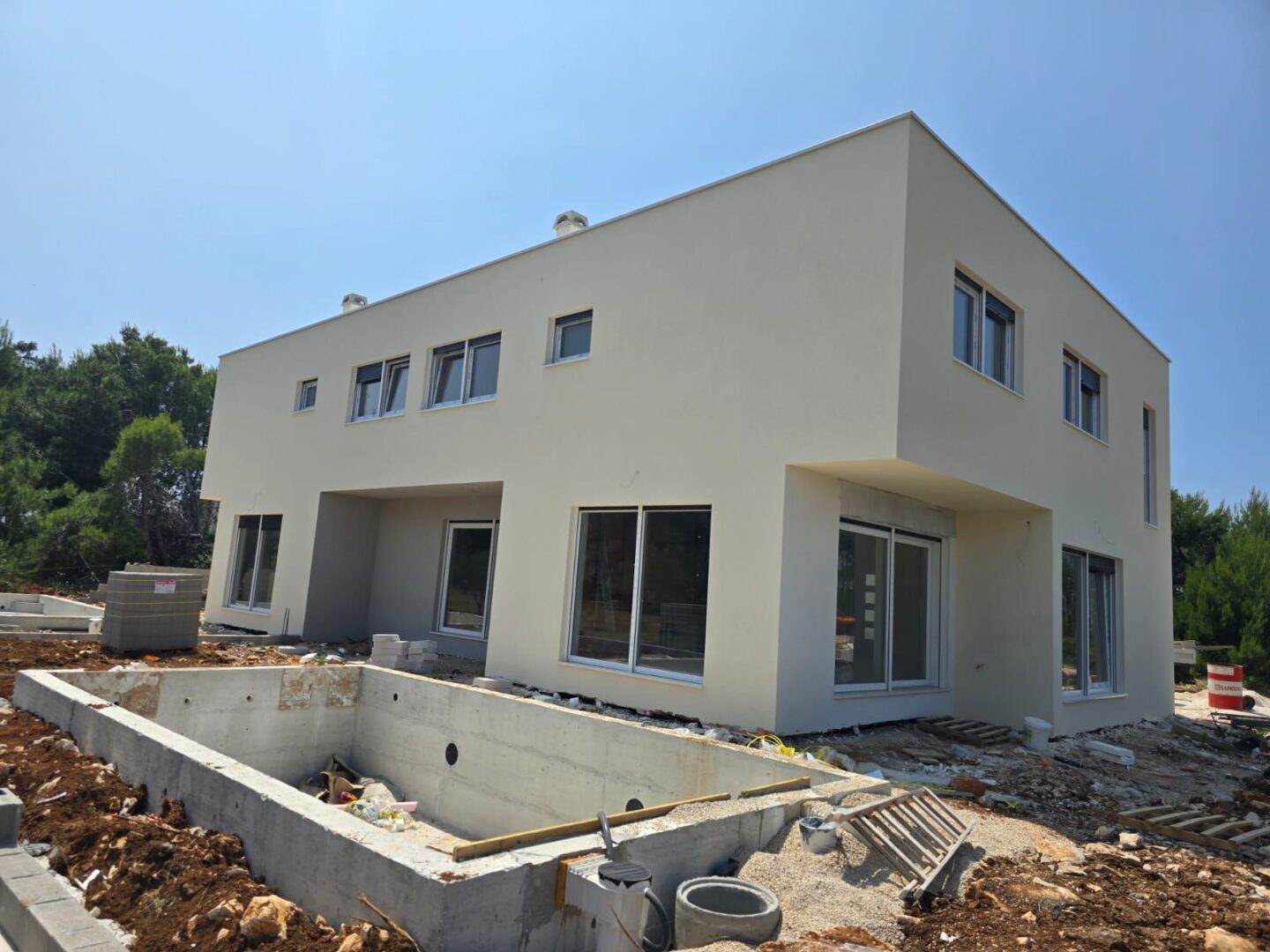 Haus 1 und Haus 3 - bestehen aus Erdgeschoss und Obergeschoss. Im Erdgeschoss gibt es eine Veranda, Eingangsbereich, WC, Küche, Wohnbereich, Abstellraum und Terrasse mit einer Gesamtgrundfläche von 111,52 m2. Über eine Innentreppe gelangt man ins Obergeschoss, wo sich zwei Badezimmer und drei Schlafzimmer befinden. Zum Haus gehört ein Teil des Gartens mit einem Pool von 29 m2 und zwei Parkplätzen.