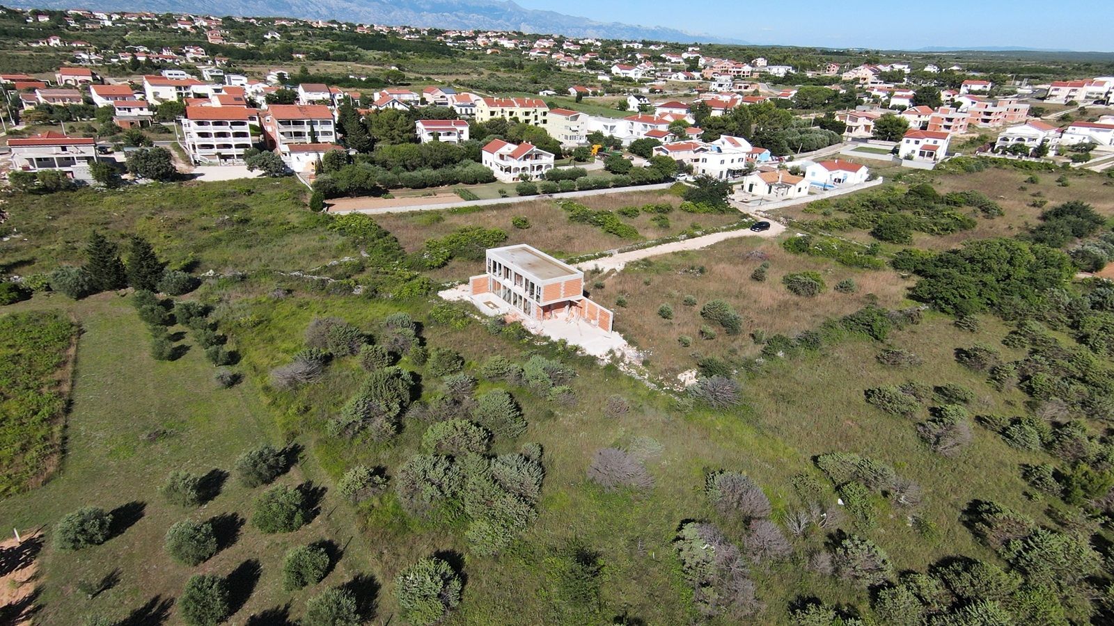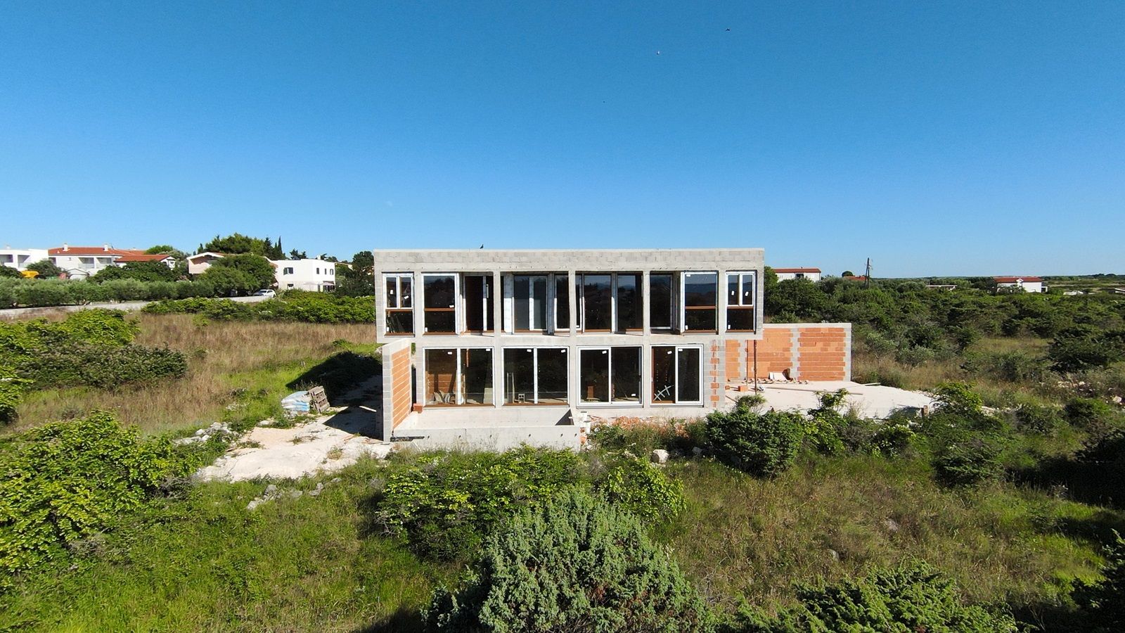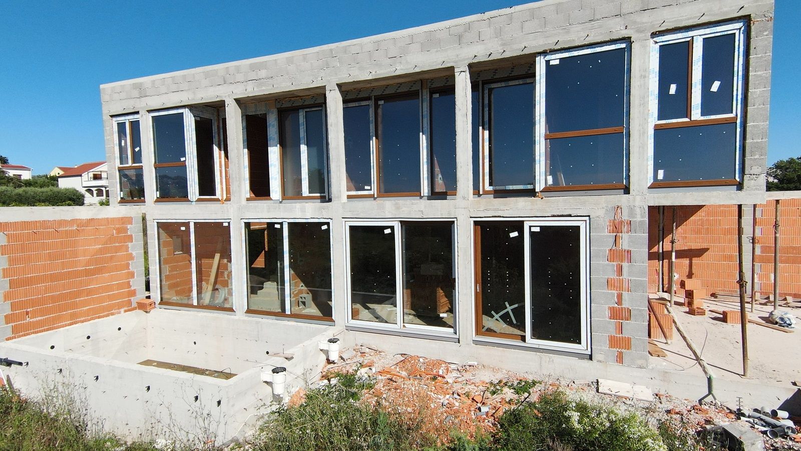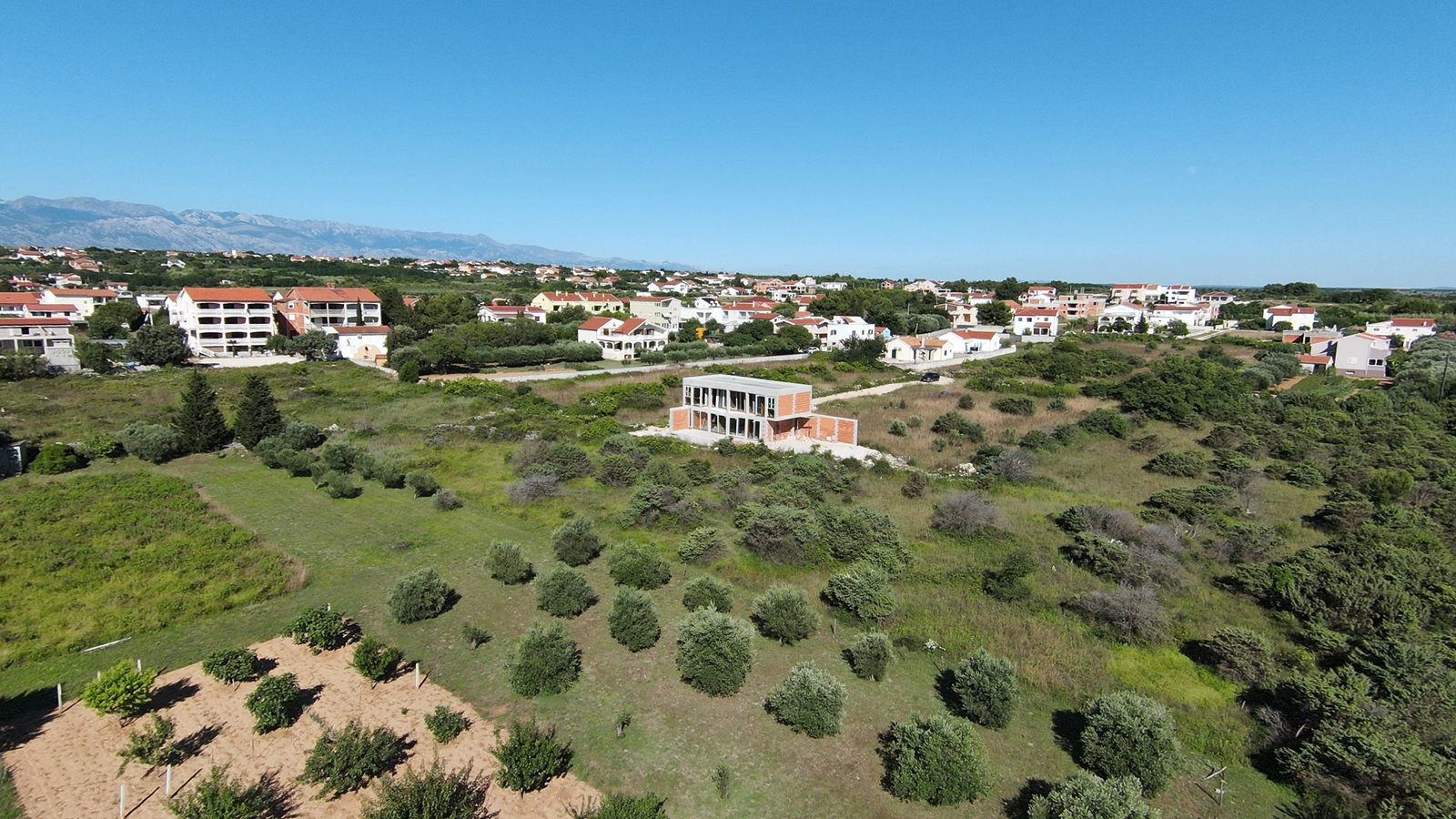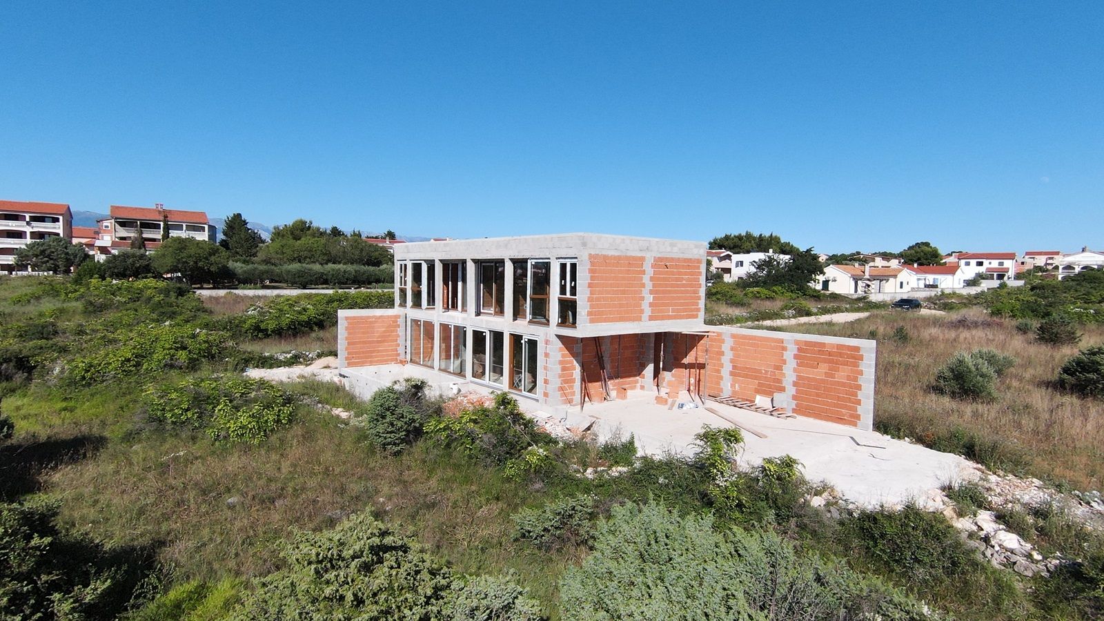 VRSI - moderne Villa mit Pool. Sie besteht aus einem Erdgeschoss und einem Stockwerk mit einer Gesamtgrundfläche von 156,20 m2. Im Erdgeschoss befinden sich der Eingang, WC, Waschküche, Flur, Treppe, Küche, Esszimmer, Wohnzimmer und eine Außenterrasse mit einem Pool von 18 m2. Im ersten Stock gibt es vier Schlafzimmer und drei Badezimmer. Zwei Schlafzimmer haben ihre eigenen Badezimmer, während die anderen beiden Schlafzimmer ein gemeinsames Badezimmer teilen. Die Schlafzimmer haben Zugang zu einem gemeinsamen Balkon.
