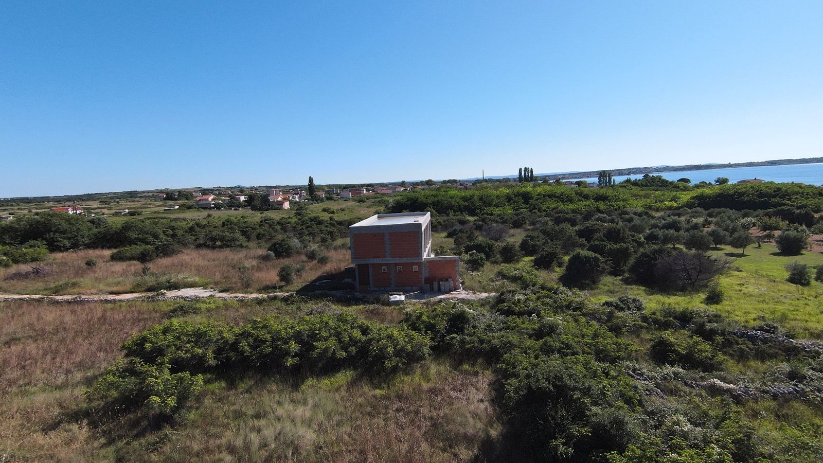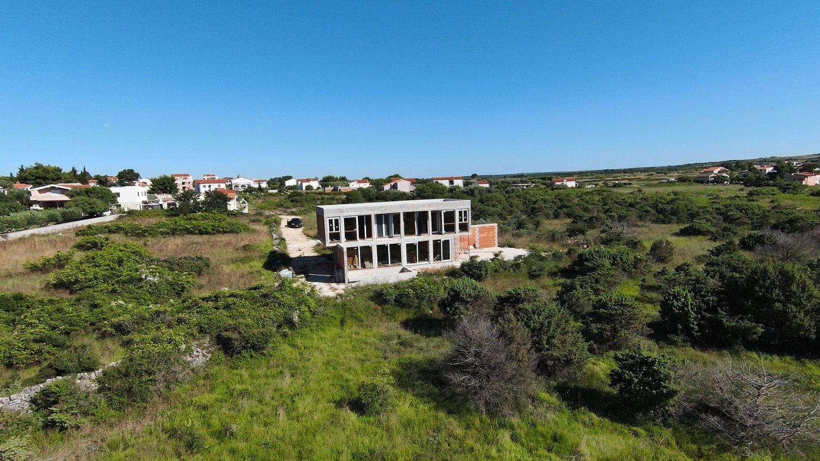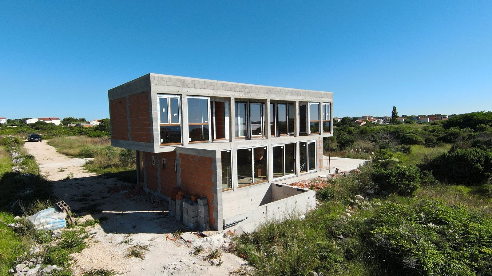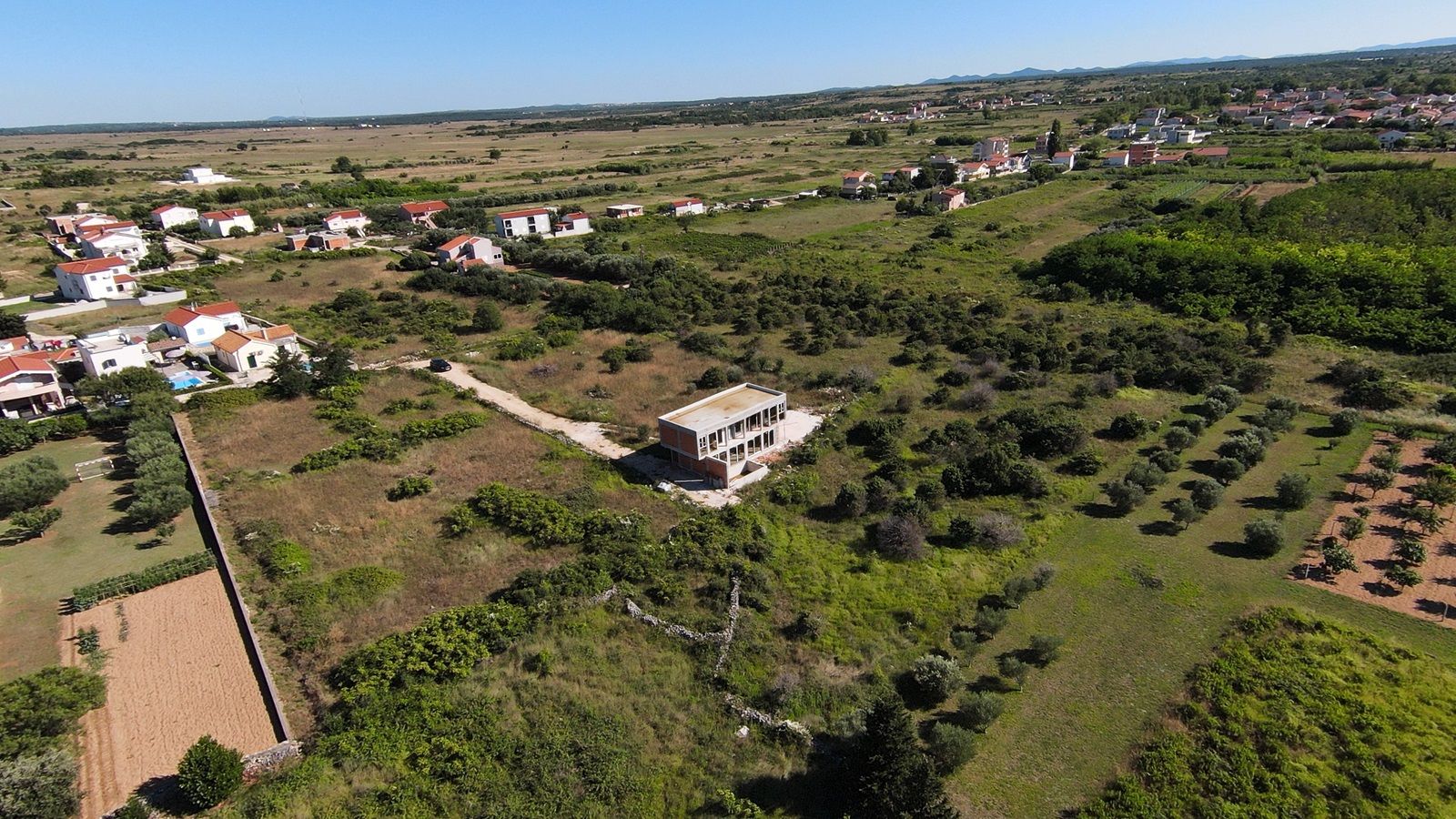 VRSI - moderne Villa mit Pool. Sie besteht aus einem Erdgeschoss und einem Stockwerk mit einer Gesamtgrundfläche von 156,20 m2. Im Erdgeschoss befinden sich der Eingang, WC, Waschküche, Flur, Treppe, Küche, Esszimmer, Wohnzimmer und eine Außenterrasse mit einem Pool von 18 m2. Im ersten Stock gibt es vier Schlafzimmer und drei Badezimmer. Zwei Schlafzimmer haben ihre eigenen Badezimmer, während die anderen beiden Schlafzimmer ein gemeinsames Badezimmer teilen. Die Schlafzimmer haben Zugang zu einem gemeinsamen Balkon.