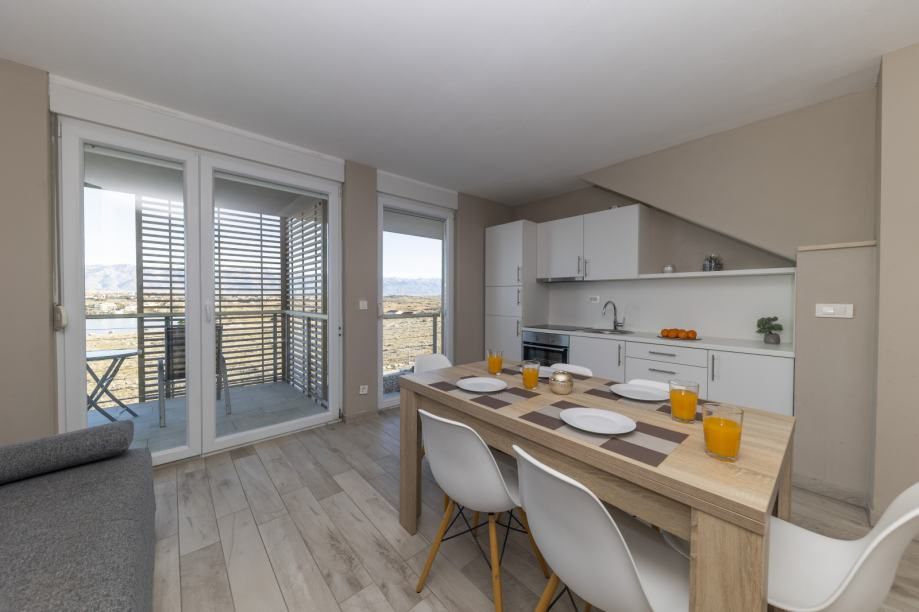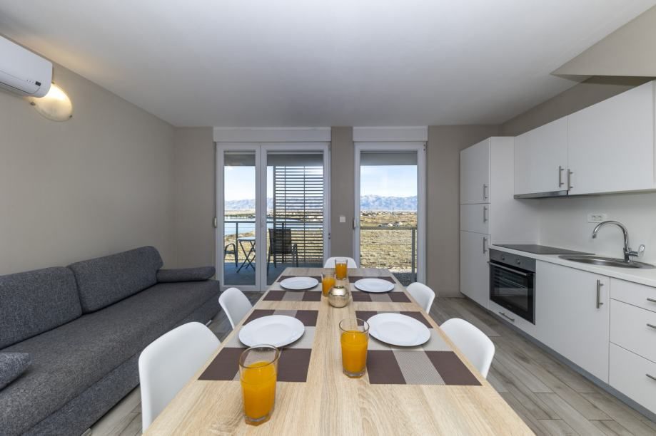 Povljana - Drei-Zimmer-Wohnung im ersten Stock eines kleinen Gebäudes mit einem herrlichen offenen Blick auf das Meer auf beiden Seiten. Die Wohnung hat eine Gesamtfläche von 72,40 m2. Sie besteht aus drei Schlafzimmern, zwei Badezimmern, einem Wohnzimmer und einer geräumigen Terrasse. Zur Wohnung gehört ein Parkplatz und das Recht zur Nutzung des gemeinsamen Pools, des Grillbereichs und des Spielplatzes für Kinder.