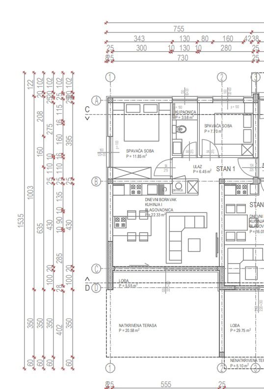 Wohnung 1 - besteht aus einem Eingangsbereich, Wohnzimmer, Loggia, überdachter Terrasse, zwei Schlafzimmern und einem Badezimmer. Die Gesamtgrundfläche der Wohnung beträgt 78,04 m2. Zur Wohnung gehören ein Garten und zwei Parkplätze.