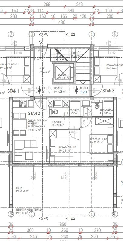 Wohnung 2 - besteht aus einem Eingangsbereich, Wohnzimmer, Loggia, unbedeckter Terrasse, zwei Schlafzimmern und zwei Badezimmern. Die Gesamtgrundfläche der Wohnung beträgt 78,11 m2. Zur Wohnung gehören ein Garten von 24,65 m2 und zwei Parkplätze.