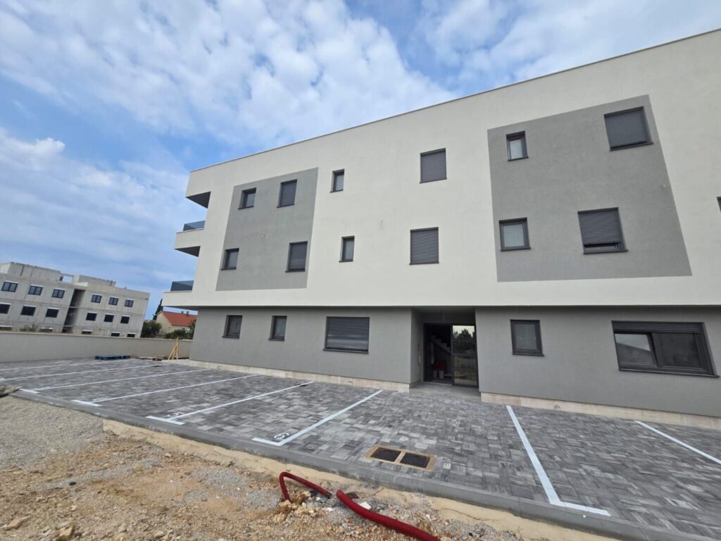 NIN – ZATON – Wohnung im Erdgeschoss mit einer Gesamtfläche von 104 m2. Die Wohnung besteht aus einem Flur, zwei Schlafzimmern, zwei Badezimmern, einer Küche, einem Wohnzimmer, einem Balkon und einer Terrasse. Zur Wohnung gehört ein Garten von 62,80 m2. Die Wohnung ist